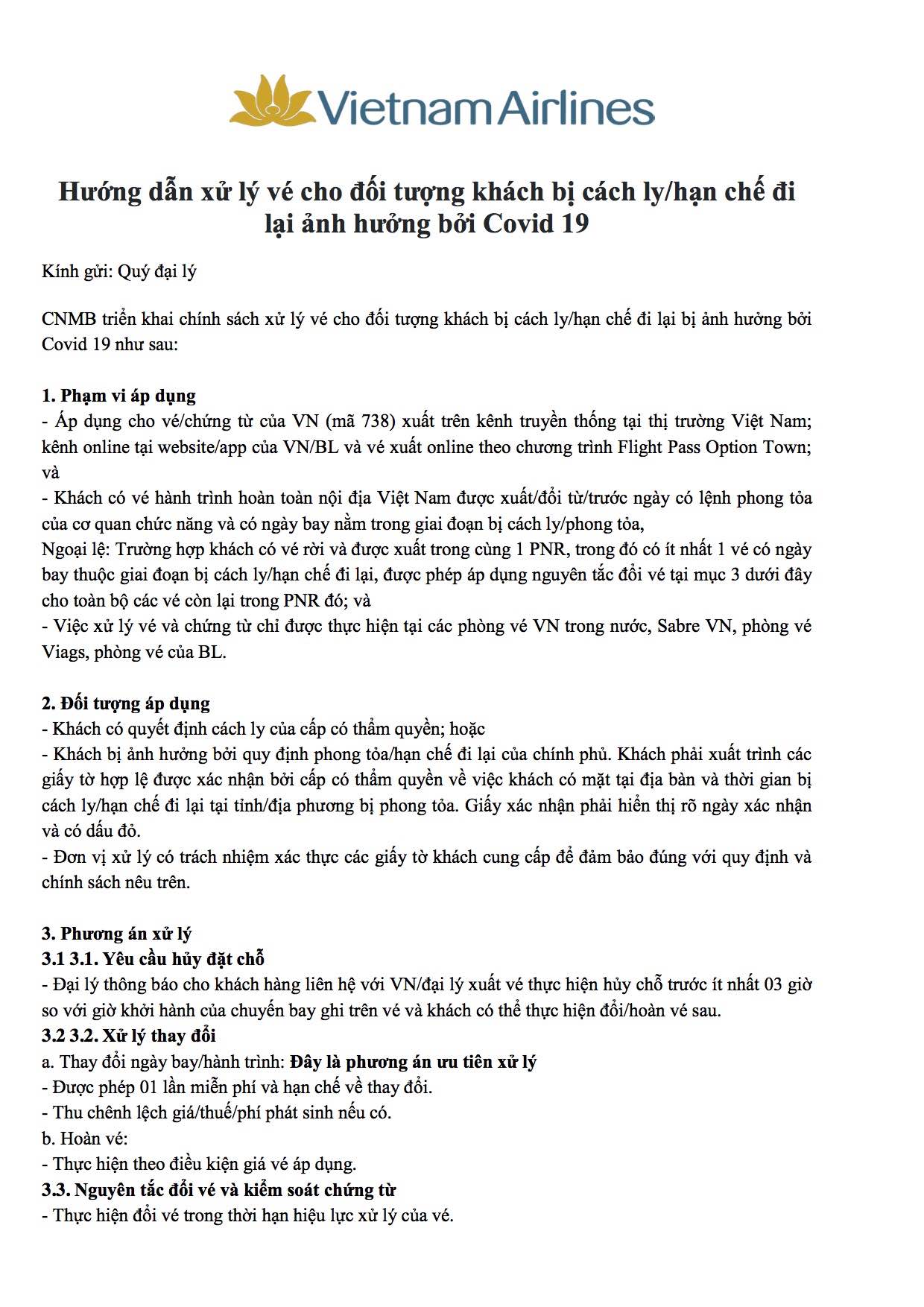 1. Vietnam Airlines: Hướng dẫn xử lý vé cho đối tượng khách bị cách ly/hạn chế đi lại ảnh hưởng bởi Covid 19.
