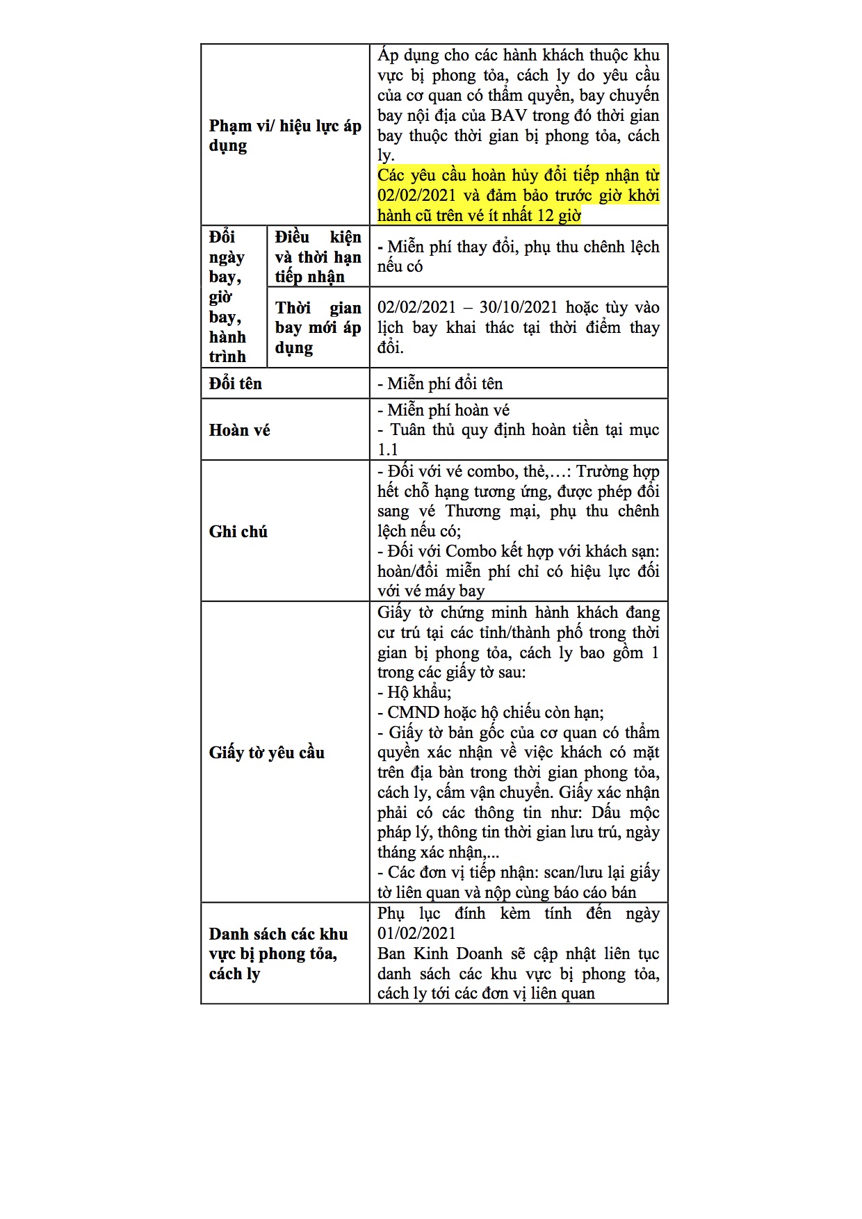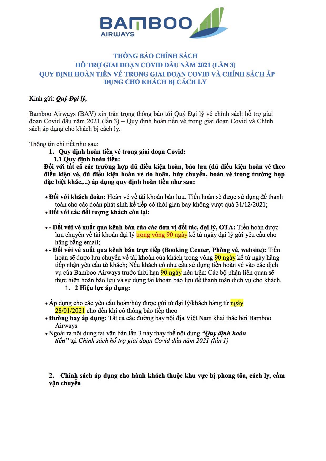2. Bamboo Airways: Thông báo chính sách hỗ trợ giai đoạn Covid đầu năm 2021 (Lần 3).