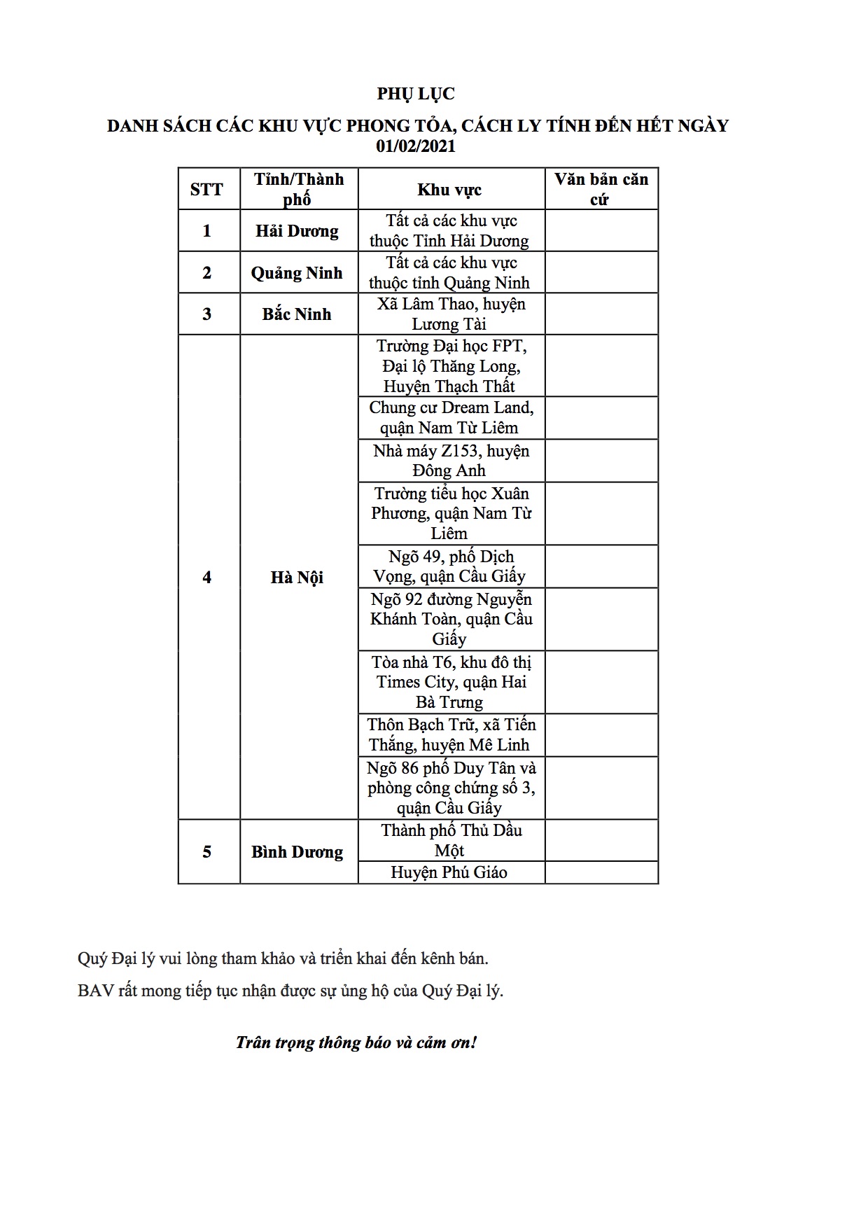Kính gửi Quý đại lý,