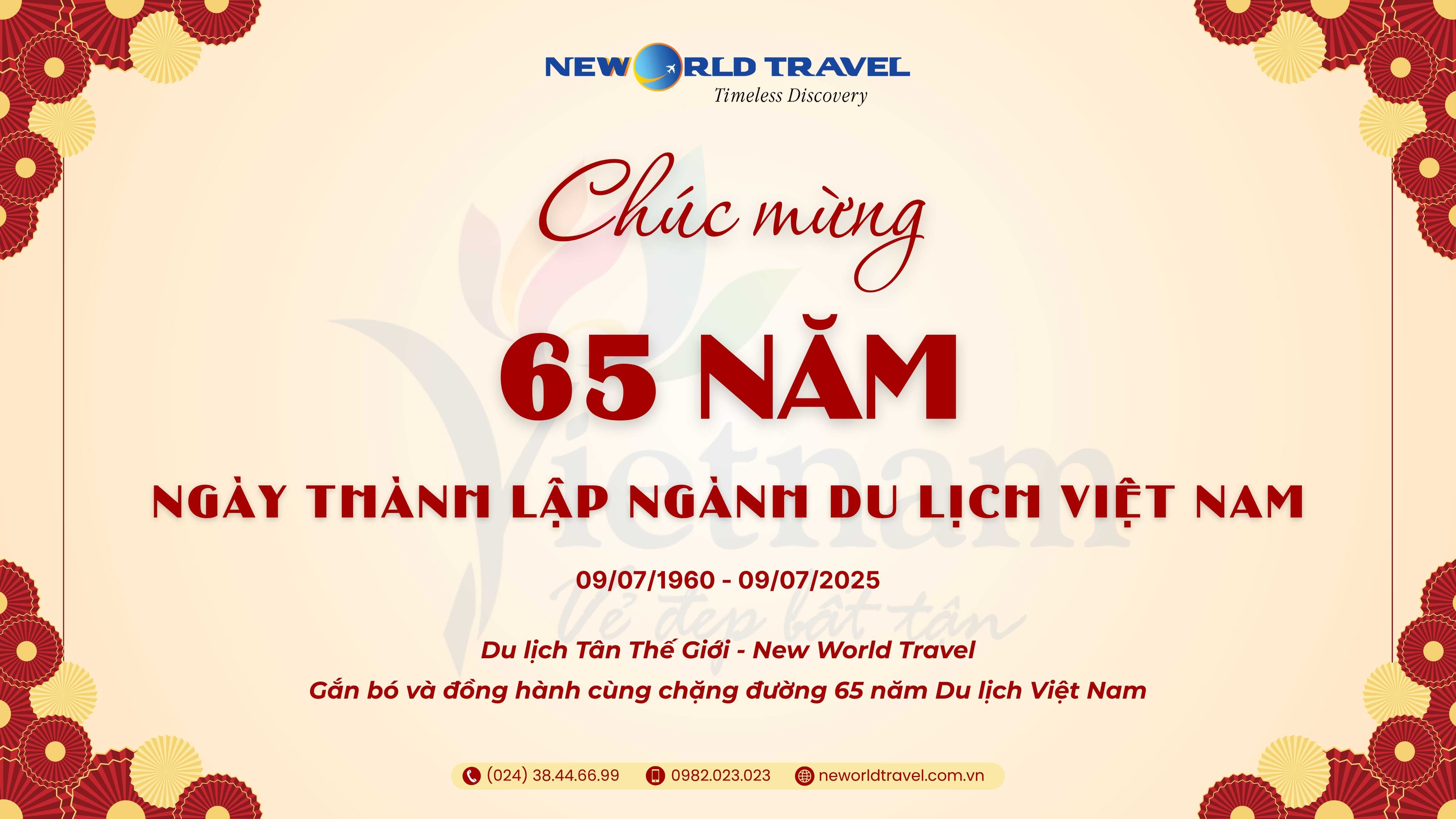 Xin chúc Du lịch Việt Nam tiếp tục vươn xa, hội nhập sâu rộng, phát triển bền vững và thăng hoa trên hành trình mới! Du lịch Tân Thế Giới - New World Travel gắn bó và đồng hành cùng chặng đường 65 năm Du lịch Việt Nam!