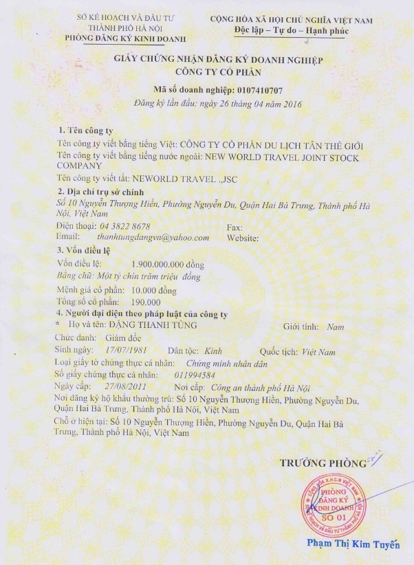 Giấy phép đăng ký kinh doanh New World Travel