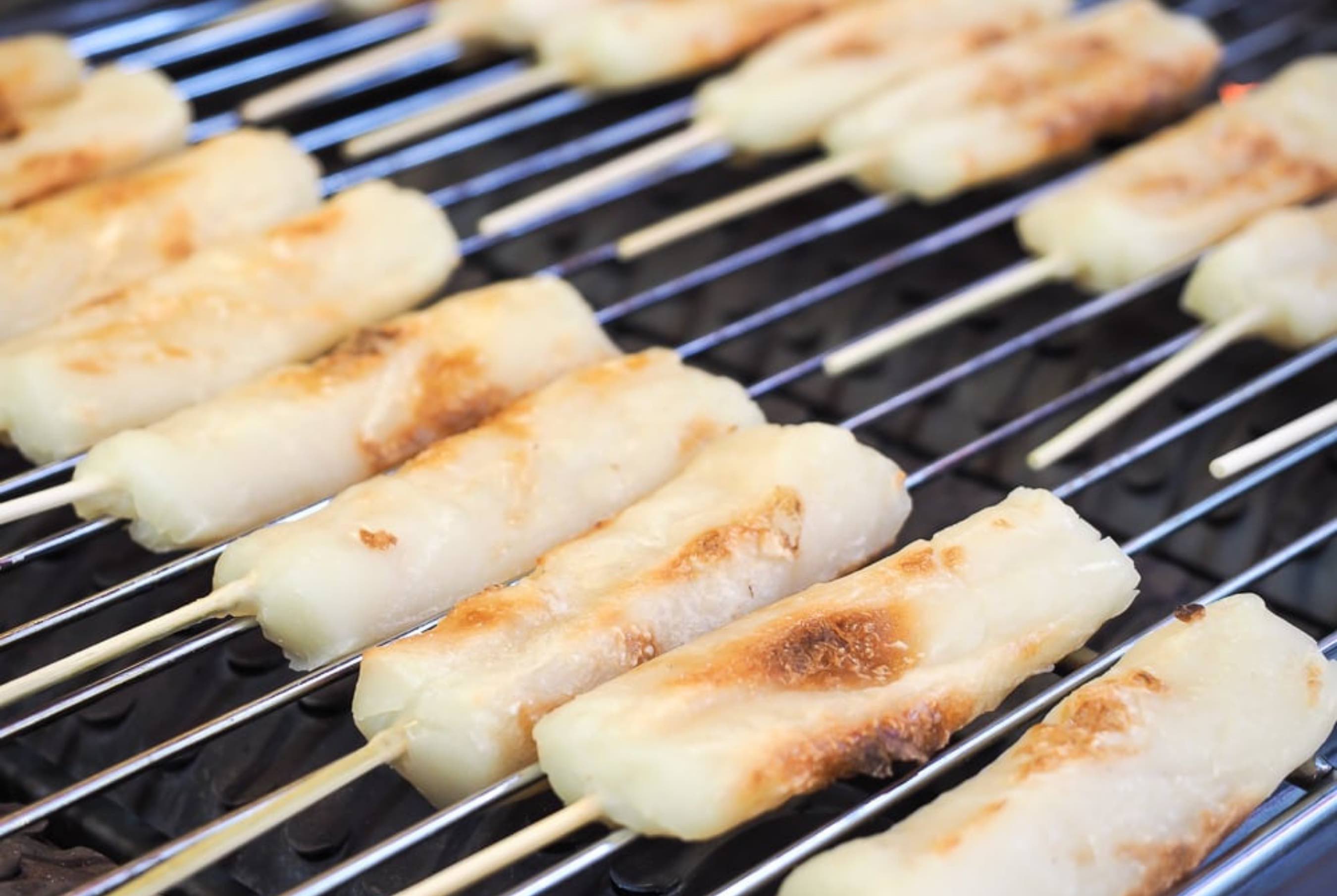 Ngay trong khu chợ đêm sầm uất Tây Môn Đinh (Đài Loan), bạn sẽ tìm thấy bánh gạo nướng phong cách Okinawa (Nhật Bản). Nhìn những que bánh gạo bản to, trắng đục được nướng xem trên than vô cùng hấp dẫn. Sau đó, bạn có thể lựa chọn đa dạng loại topping ăn cùng như sốt đậu phộng, phô mai hoặc sốt mè. Món ăn là sự tổng hòa giữa độ dẻo dai của bánh gạo với đủ hương vị của các loại topping.
