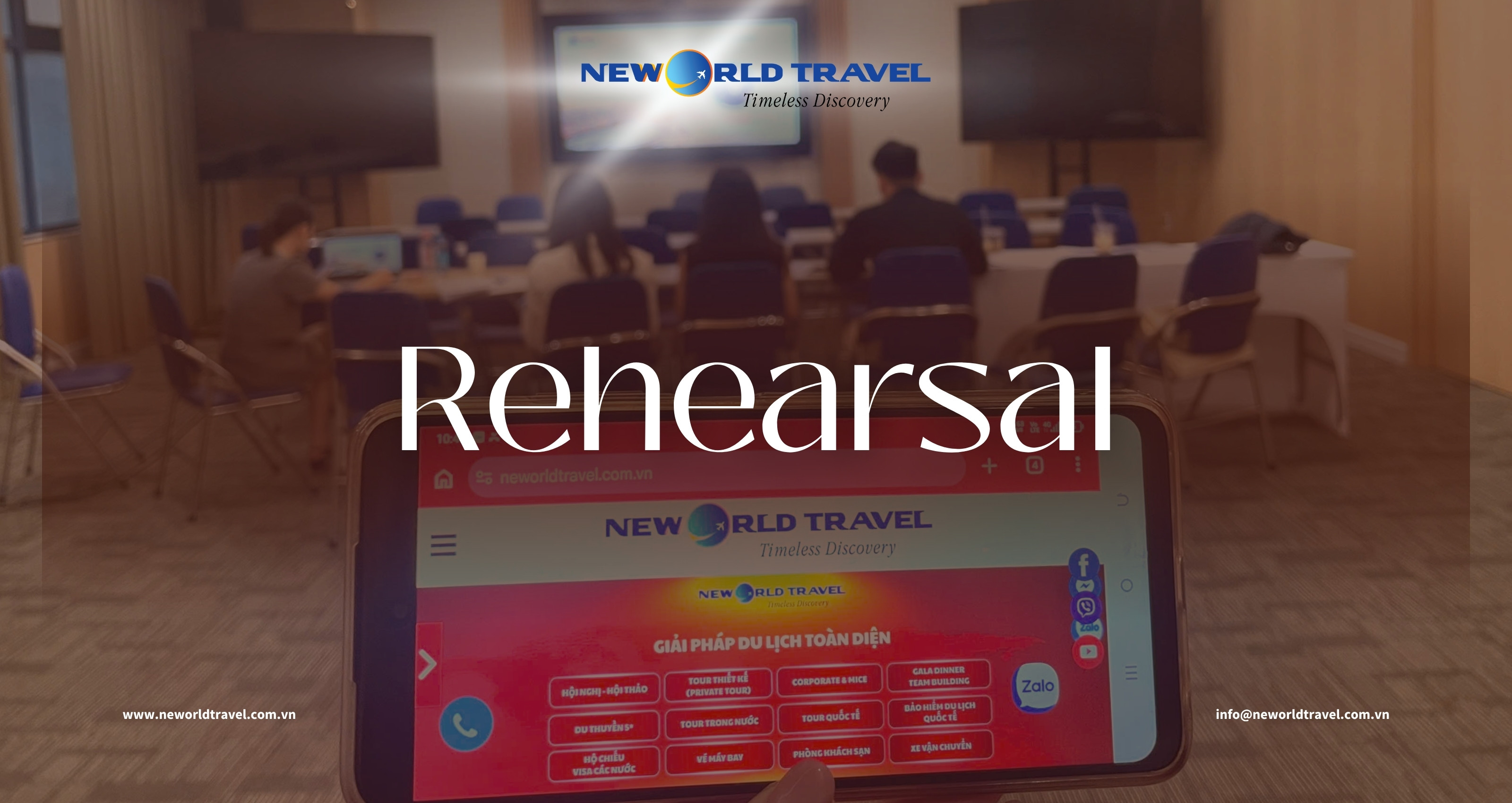 Rehearsal (Tổng duyệt) là bước không thể thiếu để một sự kiện chuyên nghiệp, mượt mà và đúng kịch bản. Tại New World Travel, mọi chương trình đều được chuẩn bị bài bản từ nội dung, timeline đến MC nhằm mang đến trải nghiệm chỉn chu, ấn tượng và trọn vẹn cho khách hàng.
